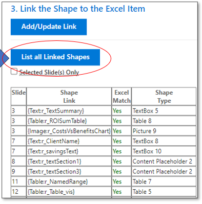As you Add/Update Links in PowerPoint you can check to make sure the Shape Link has an Excel Match by choosing “List all Linked Shapes” on the Link page of the add-in.
