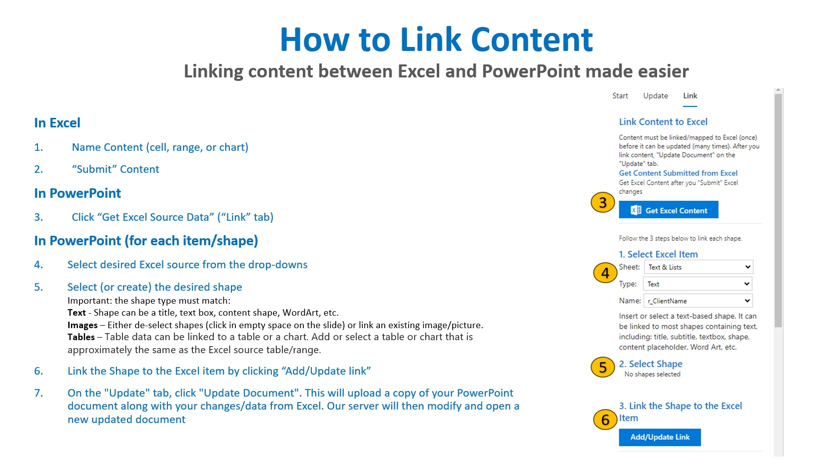 The information below shows how to link content in PowerPoint, so the content Submitted from Excel can be updated in PowerPoint.